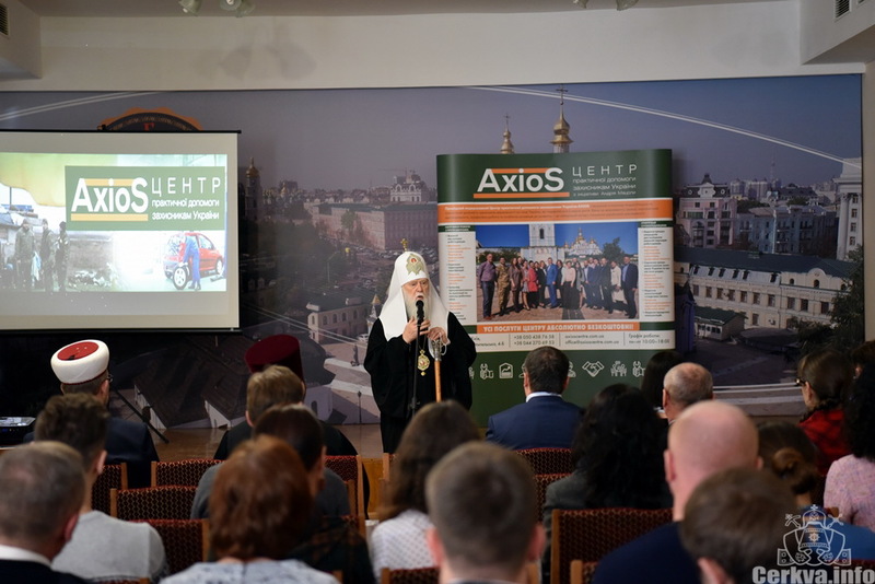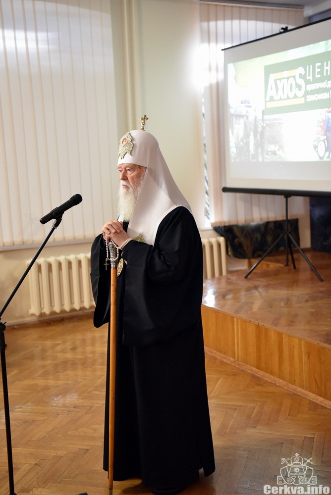 У своєму зверненні до присутніх Предстоятель Української Церкви, зокрема, зазначив: «Ми живемо в складний час, коли фактично йде війна Росії з Україною. І перед усім українським народом стоїть найважливіше завдання – зберегти Українську Державу. Господь Ісус Христос сказав, що ніхто не має більшої любові, як той, хто душу свою, тобто своє життя, віддає за друзів своїх. Кращі сини та дочки України віддають життя за нашу свободу. І ми повинні цінувати їх та їхні подвиги. Заради цього й створений Центр AXIOS – для реабілітації та допомоги нашим захисникам. Ми дуже раді, що Центр працює успішно і є взірцем для інших українських міст робити те саме. Я радий, що Центр AXIOS знайшов своє місце в Михайлівському монастирі, який свого часу прихистив молодь, котру розганяли з Майдану. Хочу ще особливо подякувати Андрію Миколайовичу Мацолі, адже він є головним меценатом цього проекту і без фінансової допомоги нічого не можна було б зробити. Закликаю Боже благословення на подальшу працю Центру AXIOS. Слава Україні!».
